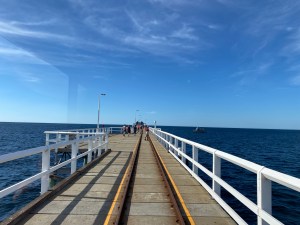 - Busselton, we hoped on the 100% electric, solar-powered jetty train across the ocean to the end of the Southern Hemisphere’s longest wood-piled jetty, measuring about 1.8km out to sea. Disembarking the train we descended 8m into the underwater observatory to take in all the natural ocean life this wonder had to offer.